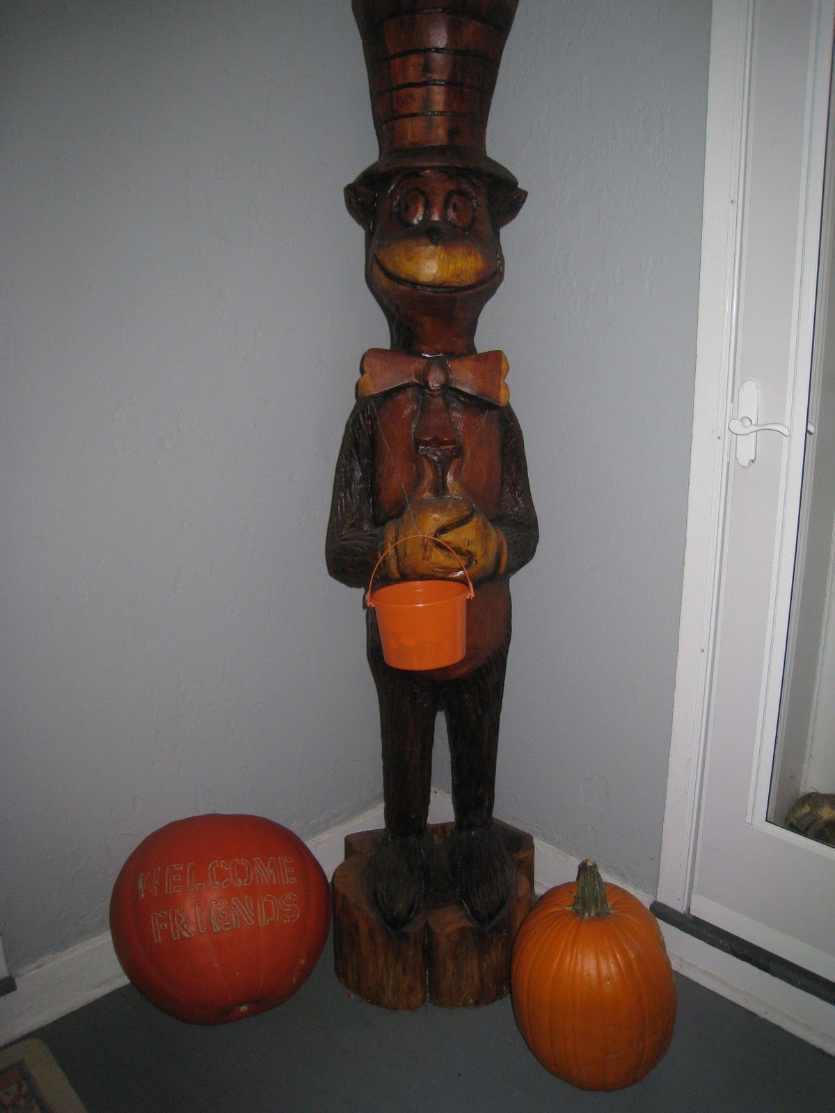 Look closely at the pumpkin on the left. Luke carved the words in it when it was young, and as it grew, so did the welcome! Of course, no fall decorations would be complete without including our own Cat in the Hat. As you can see by his smile, he likes pumpkins too!