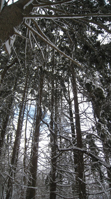 Big puffs of snow, falling from high tree limbs, float to the ground silently.
